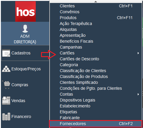 Para adicionar contas e despesas que não sejam através da entrada de notas, primeiro é necessário efetuar um cadastro do Cedente, em Cadastros > Fornecedores;