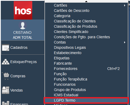 1. Acesse HOS Farma > Cadastros > LGPD Termo