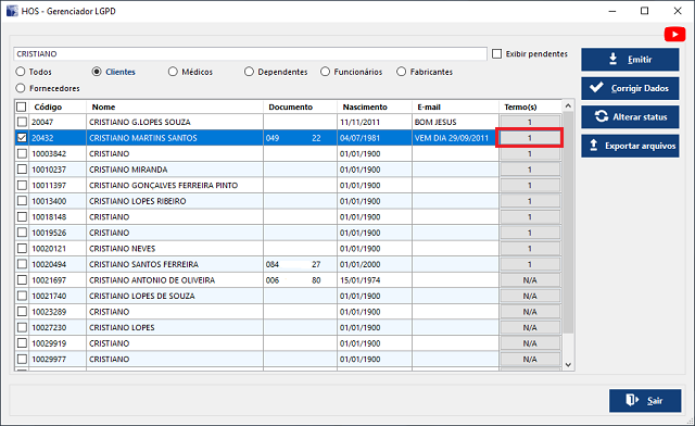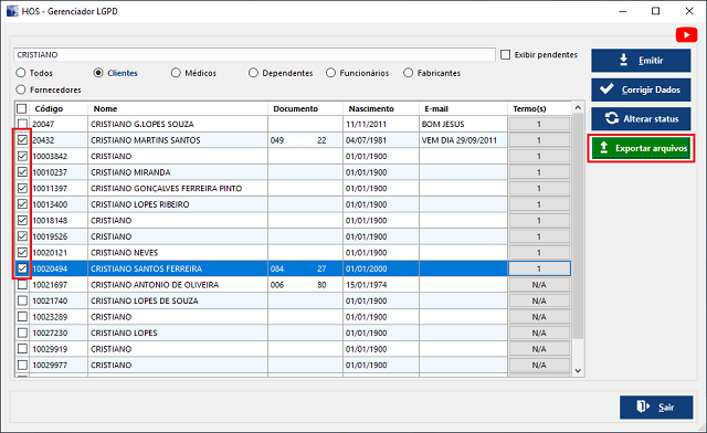 HOS Farma > Gerencial > LGPD Gerenciador1.1 Encontrar o cadastro da pessoa necessária e depois clique no botão do "Termo(s)"1.2 Clique com o botão direito do mouse sobre o nome do comprovante na coluna "Arquivo*" > Exportar arquivo1.3 Selecione a pasta onde deseja salvar e clique em "Salvar"1.4 Logo após o sistema abrirá automaticamente o arquivo