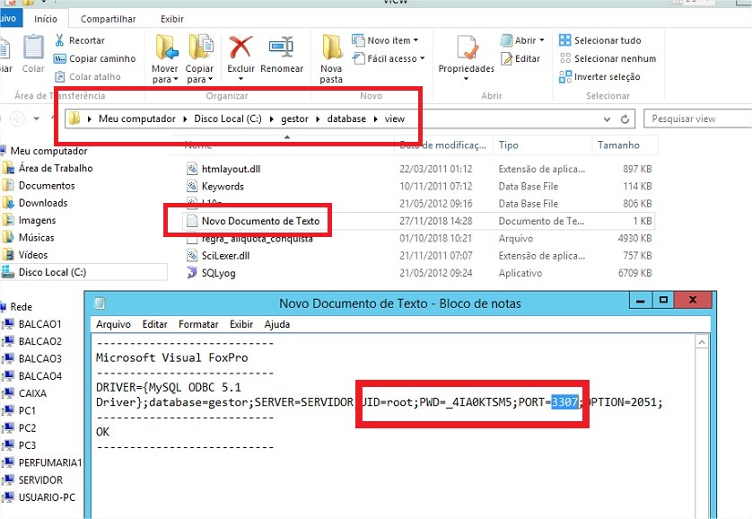 1º - Para realizar a importação de dados, é necessário que o processo seja realizado na máquina do cliente, onde é o Servidor do Xelfe, devido a versão do MySQL. Muito importante também, é possuir o usuário, senha e porta do MySQL, é necessário buscar estas informações dentro da máquina, podendo estar dentro de um arquivo no formato .TXT ou .BAT, abaixo segue um exemplo de onde foi encontrado as informações em um cliente.