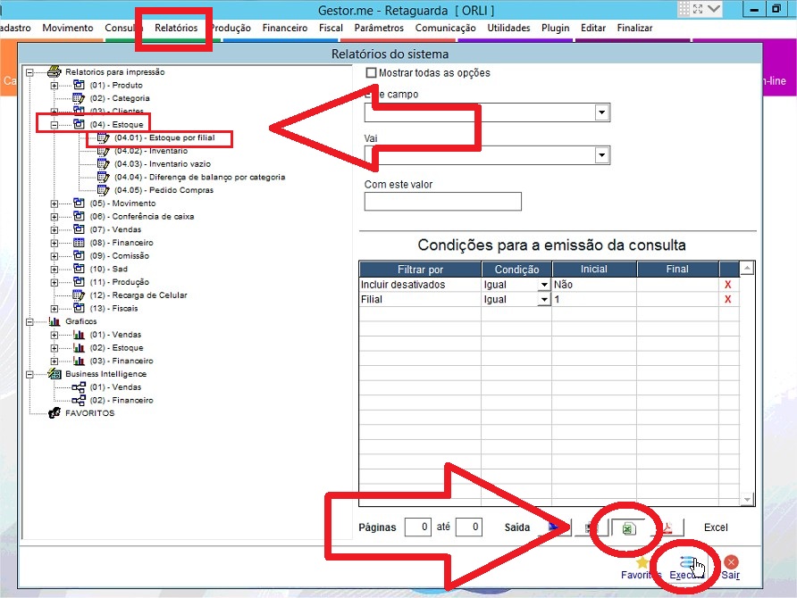 5º - Gerar um relatório de código de barras dentro do próprio sistema Xelfie através do caminho: ‘Estoque > Estoque por filial’, este será gerado em formato .xls, é necessário deixar apenas a coluna de código e código de barras, após salvar em .csv (separado por vírgula). OBS: O relatório se faz necessário devido a criptografia do código de barras no Xelfie.