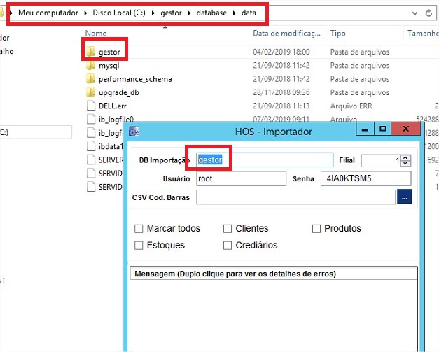6º - Executar o importador de dados, no campo ‘DB Importação’ você deve colocar o nome da pasta conforme imagem abaixo (geralmente é gestor), bem como usuário, porta, senha e o relatório em CSV gerado, após marcar os itens que deseja importar e confirmar. Desta forma, a importação será realizada com sucesso.