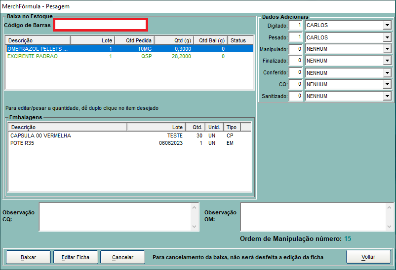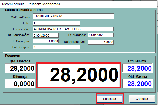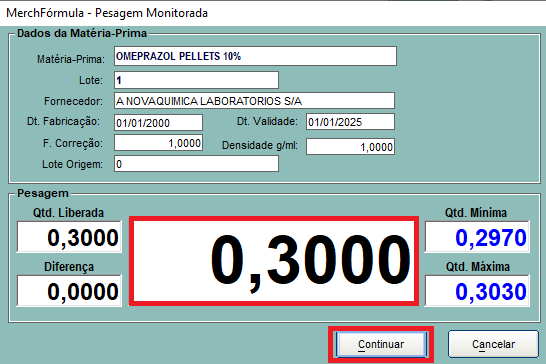 Ao efetuar a leitura, sendo a Matéria Prima e Lote correto o sistema vai abrir a próxima tela acionando a balança.