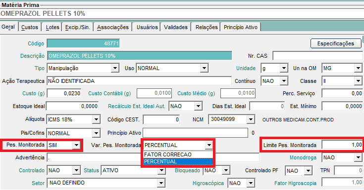 Passo 1. No cadastro de Matérias Primas, verificar se o campo Pes. Monitorada, está como SIM.