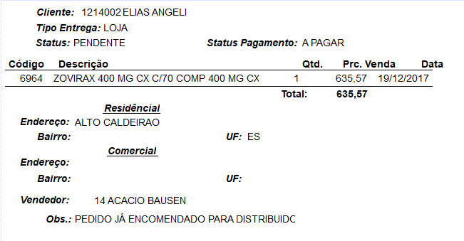 Após GRAVAR o sistema pergunta se quer emitir um comprovante. Sai em duas vias para uma ficar na farmácia e outra vai com o cliente.