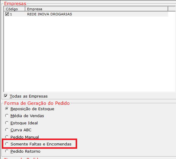 É possível FILTRAR apenas as Faltas e Encomendas para uma sugestão de pedido.