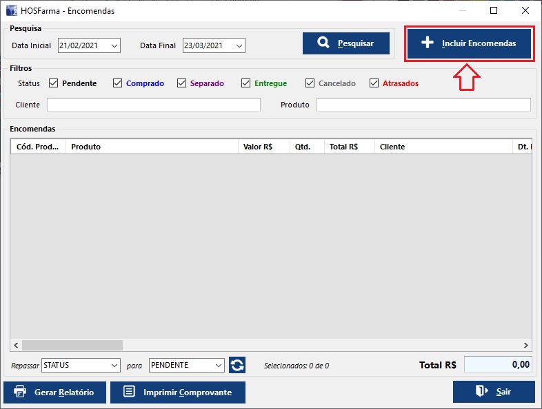 Pesquise pela data da inclusão da encomenda (Data Inicial).