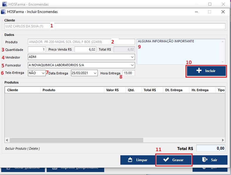 10 - Clique em INCLUIR e, caso tenha mais produtos na encomenda, repetir do passo 2 em diante. Caso contrário em seguida clique em GRAVAR.