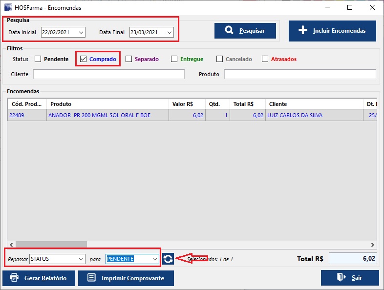 Depois de mostrado na tela de pedido o sistema, automaticamente muda o status para COMPRADO, e não aparecerá mais nesta tela, a não ser que seja alterado o status manualmente (ver instrução abaixo).