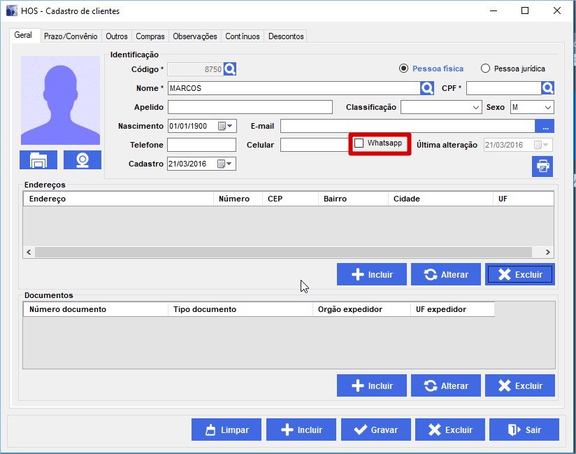 Para que seja possível a utilização do serviço, se faz necessário no cadastro de clientes marcar o Checkbox "Whatsapp".