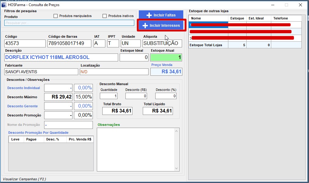 1 - Realizar a consulta do produto na tela de busca F9 e clicar no botão "Incluir Interesses";